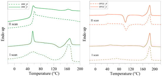 From the data reported in Table 1 and from the DSC curves of Figure 5, one can see that the two homopolymers in forms of powder displayed identical phase behavior: both were indeed semicrystalline samples, even though PPF was able to crystallize during heating scan once Tg is exceeded (∆Hcc < ∆Hm).