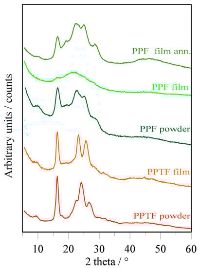 X-ray diffraction (XRD) measurements were carried out to investigate the nature of the crystal phase. Collected patterns are displayed in Figure 6. PPTF powder sample showed most significant peaks at 2θ values of 9.2°, 16.3°, 17.9°, 22.5°, 24.1°, 26.6° (d = 9.6, 5.4, 4.9, 3.9, 3.7, 3.3 Å) and crystallinity index Xc = 46 (±3)%. PPTF film was characterized by reflections at 2θ of 9.3°, 16.3°, 23.3°, 25.6° (d = 9.5, 5.4, 3.8, 3.5 Å) and Xc = 43 (±3)%. The peak positions and shape of the two patterns were different enough to assign them to different crystal phases, hereinafter named α-PPTF in case of powder sample, and β-PPTF for film sample.