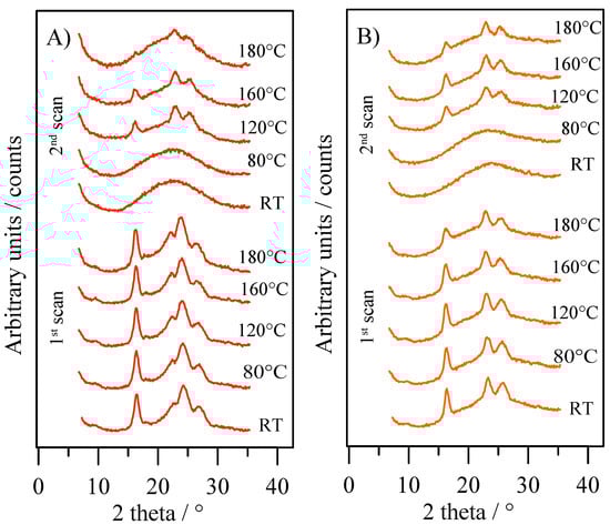 The thermal stability of the two different crystal phases present in PPTF powder and film samples were checked by in situ XRD measurements (see Figure 7). During the 1st scan process both samples showed their own crystal phase up to melting, no transformation of a phase in the other by solid-solid transition being appreciated. On the contrary, as pointed out by the patterns collected during 2nd scan, after melt quenching, the powder sample also crystallized according to the β-form, suggesting that β crystal phase could be the more stable one.