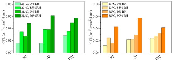 In order to explore a future application of PPTF and PPF as packaging materials, the effect of RH and temperature on the gas transmission was investigated. Figure 8 visualizes the measured values of the GTR with RH gradients of 85% at 23 °C and of 90% at 38 °C respectively. These conditions were chosen to describe the standard atmosphere and tropical ambient, respectively, as reported on the Gas Permeability Testing Manual [].
