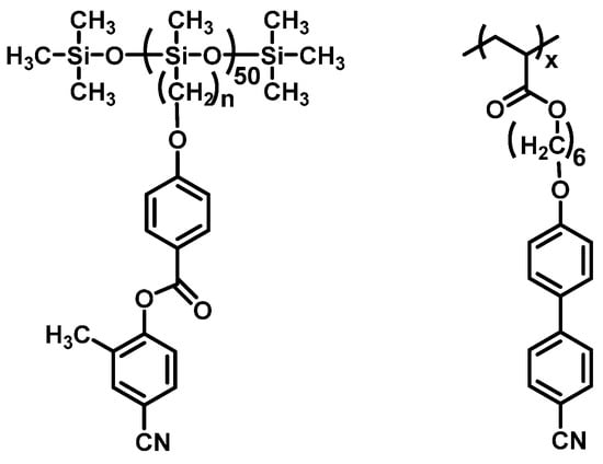 Side Chain Liquid Crystal Polymers (SCLCPs), which integrate the special anisotropy of liquid crystalline materials with the excellent mechanical performance of polymers, have attracted extensive attention over the past few decades [5,6,7,8]. Polysiloxane-based Side Chain Liquid Crystal Polymers (PSCLCPs), distinguishing themselves from traditional polyacrylate-based or polymethacrylate-based SCLCPs with much-lower glass transition temperatures (Tg), viscosities, surface energy, as well as good mechanical, thermal stabilities, and insulation performance stemming from higher bond energy and larger bond angles of the adjacent silicon-oxygen bond [9], have received considerable interest and have been applied in various fields, ranging from liquid crystal display(LCD), information storage, nonlinear optics, gas separation film, etc. [10,11,12], especially areas that require LCPs with a lower phase transition temperature.