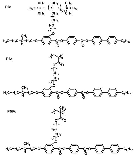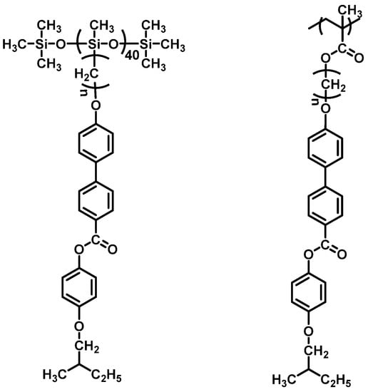 - Hsu, C.S.; Lin, J.H.; Chou, L.R. Synthesis and characterization of ferroelectric liquid crystalline polysiloxanes and polymethacrylates containing [(S)-2-methyl-1-butoxylphenyl 4-(alkyloxy) biphenyL4′-carboxylate side groups. Macromolecules 1992, 25, 7126–7134. [Google Scholar] [CrossRef]