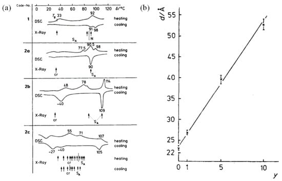- Diele, S.; Oekiner, S.; Kuschel, F. X-ray investigations of liquid crystalline homo- and copolysiloxanes with paired mesogens. Makromol. Chem. 1987, 188, 993–2000. [Google Scholar] [CrossRef]