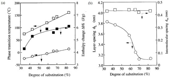 - Yonetake, K.; Nakagomi, M.; Ueda, M.; Masuko, T. Effects of the degree of substitution on the properties and structures of side chain liquid crystalline polysiloxanes. Polym. J. 1997, 29, 240–244. [Google Scholar] [CrossRef]
