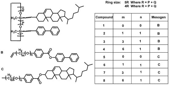 Chemical structures of the polysiloxanes and copolysiloxanes containing mesogenic unit [102].