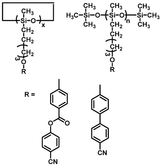 - Milano, J.C.; Robert, J.M.; Vernet, J.L.; Gallot, B. The thioether spacer in liquid crystalline polysiloxanes with cyano- and nitrobiphenyl mesogens. Macromol. Chem. Phys. 1999, 200, 1580–1586. [Google Scholar] [CrossRef]
