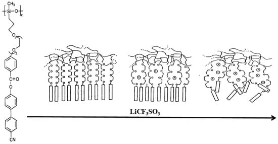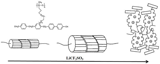 - Lin, C.; Cheng, P.; Blumstein, A. Side chain liquid crystalline ionic polysiloxanes. Mol. Cryst. Liq. Cryst. 1995, 258, 173–183. [Google Scholar] [CrossRef]
