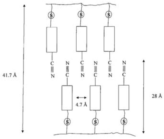 Diele et al. explored the dependence of the amount of substitution on liquid crystalline structure by means of X-ray diffraction analysis. They synthesized several series of liquid crystalline homopolysiloxanes and copolysiloxanes with different distances between successive dimesogenic side groups linked with the polymer backbone (as shown in Figure 8) [117,118]. Results showed that all the copolymers exhibited smectic phase and two mesophases were found for the homopolymers. The phase transition temperatures of SmA-I increased with the composition of the mesogenic unit. Furthermore, X-ray diffraction results suggested that the smectic monolayer thickness remarkably depended on the amount of substitution, and due to the domaining interaction of the mesogenic groups, a flexible polysiloxane backbone was forced to take part in the layer formation (as illustrated in Figure 9).