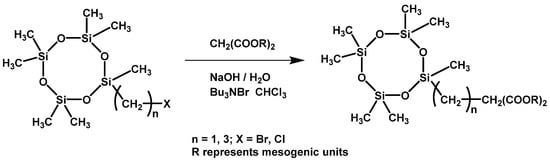 Williamson nucleophilic substitution is a common method to prepare ether compounds, and is of great significance in organic synthesis. Using this reaction, Zhang X. L. et al. synthesized novel cyclotetrasiloxane materials with mesogens or cyclotetrasiloxane LCs based on halogen-substituted cyclotetrasiloxane under a phase transfer catalyst (as shown in Scheme 7) [65,66]. However, due to the influence of the substrate reactivity, molecular structures and other factors, the Williamson nucleophilic substitution reaction has been found to be suitable for the synthesis of polysiloxane liquid crystal materials with a relative low degree of polymerization.