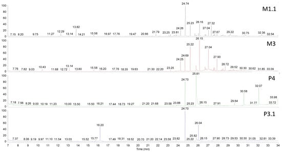 Chromatograms corresponding to samples M1.1, M3, P4, and P3.1 are presented in Figure 1.