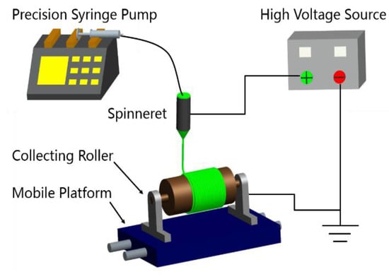 The electrospinning apparatus was schematically shown in Figure 2. The precision syringe pump provided a steady and continuous supply of solution for the syringe. The high-voltage power supply was applied to the nozzle to supply an electric field force for electrospinning. A rotating roller was used to collect nanofibres and the roller was mounted on the mobile platform moving laterally, so that the collected nanofibre mat had a certain width and uniform thickness. The related parameters of electrospinning are summarized in Table 1.