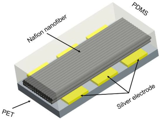 Generally, ionic polymer-metal composites were fabricated by electroless plating Pt electrodes on both sides of the Nafion-117 film, just like a “sandwich” structure, but this structure was not suitable for Nafion nanofibre mats. An experimental mechanism schematic which was used to test the characteristics of mechanoelectrical transduction based on ordered Nafion nanofibre mats is shown in Figure 3. The Nafion nanofibres mat was fabricated by electrospinning. The substrate was a PET film. The electrodes were evenly coated on the substrate by silver paste. The size of the silver electrodes was 25 mm × 5 mm and the spacing between them was 2 mm. Then, it was heated at 60 °C for 30 min to solidify it. The Nafion nanofibre mat was put on the electrodes along the direction perpendicular to the electrodes. The PDMS was directly poured onto the surface of the nanofibre mat and placed for 30 min to fully fuse the nanofibers with PDMS. Then, the sample was placed in a drying oven and heated for three hours at 70 °C, which completely solidified the PDMS. Finally, the mechanoelectrical transduction mechanism was soaked in the saturated solution of LiCl for 12 h to make the nanofibres fully exchange the cations of Li+.