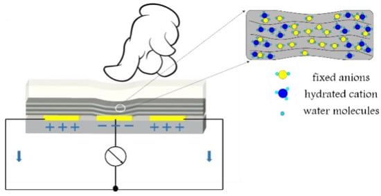 The schematics of mechanoelectrical transduction based on the ordered Nafion nanofires mat are illustrated in Figure 4. Under the state of no load, the hydration cations were evenly distributed in Nafion nanofibres due to the effect of static electricity. When applying the pressure in the middle of the Nafion nanofibre IPMC, the PDMS layer exhibited plastic deformation. Meanwhile, the deformation was transferred to the Nafion nanofibres and resulted in the move of hydration cations to both sides along the direction of the nanofibres. A voltage difference was produced between the intermediate electrode and the electrodes of both sides due to fixed anions and moving hydrated cations. When the electrodes were connected to the wire, the voltage and current signal could be measured.