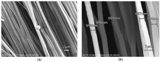 Ordered Nafion Nanofibres were produced by electrospinning under high voltage. The nanofibre mat was collected by using a rotated roller. It took 36 h to obtain a nanofibre mat with the dimensions of 300 μm in thickness and 20 mm in width. The surface morphology of the nanofibre mat is shown in Figure 5a. It can be seen that the ordered Nafion nanofibres have good directionality and are arranged closely under the collection of the rollers. The diameter of Nafion nanofibres was between 600 nm and 800 nm and the nanofibres presented good homogeneity, as shown in Figure 5b. Considering the PDMS was hydrophobic, the quality of the mat in air was compared with the mat immersed in deionized water. The quality of the mat was increased after immersing it in the deionized water. It could be concluded that PDMS does not affect the water absorbability of the nanofibres.