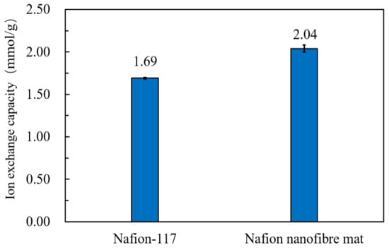 The properties of the sample mat are summarized in Table 2. The size of the sample was 15 mm in length and 10 mm in width. The data in Table 2 was the average value of five experiments. The WUP of the Nafion nanofibre mat was greater than the commercial film of Nafion-117. As shown in Figure 6, the WUP of the Nafion nanofibre was up to 52.92%, due to the large porosity between nanofibres that can preserve the water molecules well. In addition, the nanofibre had a large specific surface area, which ensured that the hydrophilic ion cluster made full contact with water in the nanofibre. The IEC of the Nafion nanofibre mat was higher than Nafion-117. As shown in Figure 7, the IEC of the Nafion nanofibre mat was up to 2.04, which indicates that the amount of hydrophilic ionic cluster in the Nafion nanofibre mat was more than that of Nafion-117, and the cation in the Nafion nanofibre mat was more than that of Nafion-117, meaning that it would generate more electrical output. The proton conductivity of the Nafion nanofibre mat was 0.998 S/cm, compared with 1.24 × 10−3 S/cm of Nafion-117. The proton conductivity of the Nafion nanofibre mat was much greater than that of Nafion-117. This indicates that the ion channel of the Nafion nanofibre mat has a certain orientation, so that the hydrated cations can transfer easily along the direction of the nanofibre. Moreover, due to the constraints of the nanofibre boundary, it was difficult for the hydrated cations to leave the ion channel in the nanofibre and most of them could only transfer along the length direction of nanofibre, so the proton conductivity was significantly improved.