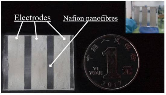 When an external force is applied on the PDMS layer of Nafion nanofibre IPMC, the Nafion nanofibre mat is compressed and deformed. This causes the cations to transfer to both sides with water molecules inside the nanofibre. A sample of Nafion nanofibre IPMC is illustrated in Figure 8. Because of the movement of hydrated cations, the concentration of the cations was nonuniform. This generates a potential difference between the center electrode and the electrodes on both sides of Nafion nanofibre IPMC. The generated potential difference prompts the movement of the external circuit electrons to form an electrical signal.