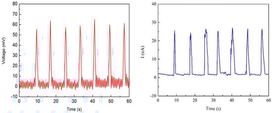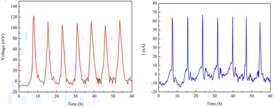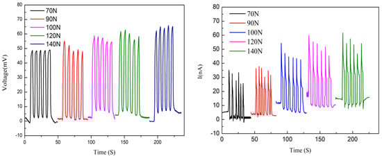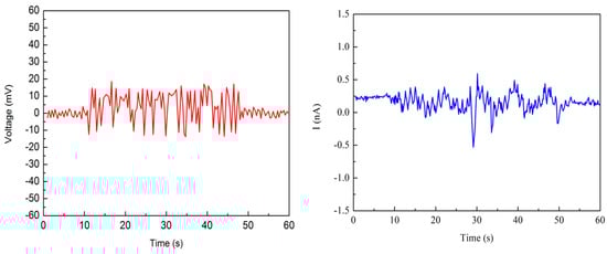 Two Nafion nanofibre IPMCs were fabricated to test the electrical output. The thickness of the Nafion nanofibre mat was 203 μm and 310 μm, respectively. Figure 9 and Figure 10 show the electrical output under the reciprocating load, respectively. The load was 100 N and the frequency of the load was 0.125 Hz. When measuring the output of the sample, the open circuit voltage and short circuit current could be obtained. The graphs showed that the open circuit voltage and short circuit current were in pace with the periodic changes of the load. The open circuit voltage of the 203 μm thick nanofibre mat was near 55 mv, and that which was 310 μm thick was near 100 mv. The short circuit current of the sample with the 203 μm thick nanofibre mat was near 25 nA, and that which was 310 μm thick was near 60 nA. It can be seen that the thicker the nanofibre mat is, the larger the electrical output is. As the thickness of the nanofiber mat increases, the number of cations also increases. More cations movement forms a greater potential difference between the electrodes under mechanical deformation.