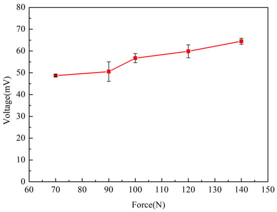 The electrical output under different external loads was measured. The open circuit voltage and short circuit current are shown in Figure 12, respectively. It can be seen that the open circuit voltage and short circuit current increased with the increase of the external load. But the increasing extent of open circuit voltage and short circuit current was not very high. Therefore, it can be inferred that the change of external load has little effect on the transfer of internal ions of Nafion nanofibre IPMC. Figure 13 shows the relationship between the applied force and the peak output voltage. It is a non-linear relationship.