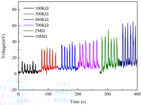 In order to measure the output power of Nafion nanofibre IPMC, a load resistance was put in series. Figure 14 shows the results of the output voltage under different load resistances. It can be seen that with the increase of the load resistance, the voltage also increases. The output power of Nafion nanofibre IPMC could be calculated by: