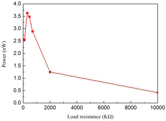 Figure 15 shows the output power with different load resistances. When the external load resistance is equal to the internal resistance of Nafion nanofibre IPMC, the output power of the load resistance is the maximum. The maximum value of output power was 3.63 nW, when the resistance was 300 KΩ. It illustrates that the internal resistance of the device is near 300 KΩ. The optimal electrical output would be gained under this external load resistance. Compared to traditional IPMC, the output power of 3.63 nW was effectively enhanced. Considering the mass of the Nafion nanofibre mat (the mass of the nanofibre mat was 0.0856 g), the power density of the Nafion nanofibre IPMC would be up to 42.4 μW/Kg.