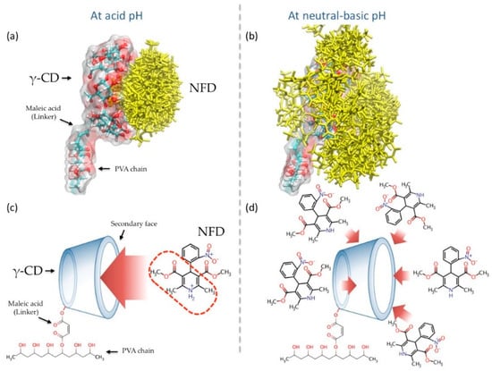 (a,b) Spatial distribution of the 200 conformations with the best interaction energy for the complexes: PVAchain-MaleicAcid-γ-CD/NFD at acid and neutral-basic pH, respectively. (c,d) Representative description of the inclusion processes that led to the formation of the γ-CD/NFD complex at acid and neutral-basic pH, respectively.