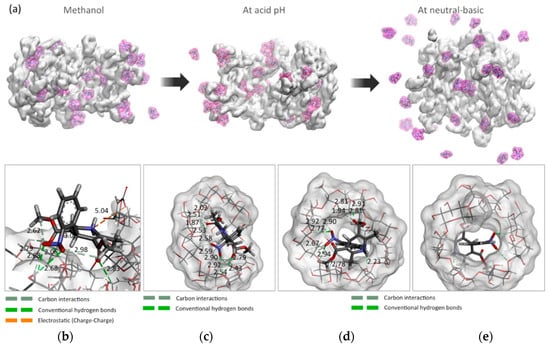 (a) Snapshots of the final results of each molecular dynamics simulation between γ-CDPVAHMA and NFD in methanol and in environment of acid and neutral-basic pH. Snapshots of the main intermolecular interactions generated between γ-CDPVAHMA and NFD: (b) in superficial nano-cavities of the hydrogel; (c) with the hydrophobic cavities of γ-CD added to the hydrogel; and (d,e) front and back face of the γ-CD/NFD inclusion complex.