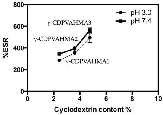 The synthesized hydrogels in this work present pH-dependent swelling behavior due to ionic networks. These ionic networks contain acidic pendant groups contributed by the MA with two kinds of pKa (pKa1 = 1.94 and pKa2 = 6.22) [47]. In aqueous media of appropriate pH and ionic strength, the pendant groups are ionized developing fixed charges on the hydrogel. Typically, changing conditions such as temperature and pH, among others, results in a homogeneous expansion or contraction of hydrogels in all directions [48]. The swelling degree in all cases is higher at pH 7.4 than 3.0 in these hydrogels; therefore, the ionization occurs when the environment pH is above the pKa of the ionizable group (at pH 7.4). As the ionization degree increases (increased pH of the system from 3.0 to 7.4), the number of fixed charges increases, causing an increased electrostatic repulsion between chains into the networks. Due to the above, network hydrophilicity increases and boosts swelling degree [49]. Therefore, in this case, when increasing the pH, the electrostatic repulsions produced that the uptake of solvent into the network increased and the hydrogel expanded. On the other hand, the incorporation of γ-CD into the hydrogels leading to the increase in ESR as shown in Figure 5, which could be explained by the several hydroxyl groups on γ-CD forming hydrogen bonds with water molecules [17].