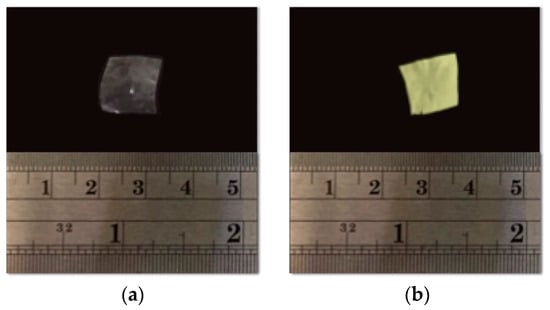 Photographs were used to compare the macromorphology of the dried samples; γ-CDPBHMA3 without NFD and γ-CDPVAHMA3 with NFD are depicted in Figure 7. Figure 7a,b shows photographs of γ-CDPVAHMA3 without and with NFD, respectively. The presentation of γ-CDPVAHMA3 without NFD was transparent unlike the yellowish appearance of γ-CDPVAHMA3 with trapped NFD.