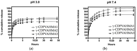In vitro NFD cumulative release from the NFD-loaded γ-CDPVAHMAs was investigated by monitoring the amounts of cumulative released NFD from three different NFD-loaded γ-CDPVAHMA formulations in two-model solution mixtures at pH 7.4 and pH 3.0 at 25 °C as a function of time. The results reported here are interesting according to the kinetic release of NFD. As shown in Figure 8a, at pH 3.0 NFD cumulative release (%) profiles the three γ-CDPVAHMA formulations offered a burst release that lasted approximately 2 h, at which 59.1%, 51.9% and 46.8% of the NFD had been released from γ-CDPVAHMA1, γ-CDPVAHMA2 and γ-CDPVAHMA3 hydrogels, respectively. In accordance with previous reports, in the first part of release, the “burst effect” of NFD release was produced [17,51]. Possibly, this quick release is due to the remaining free NFD molecules around the hydrogel surface. After this fast release phase, a slower and steadier stage of NFD release into the medium called zero-order for all three cases of γ-CDPVAHMAs is produced. On the other hand, when the γ-CD content in the formulation increased, the release speed reduced, as depicted in Figure 8. This could be attributed to different factors that can involve the creation of a complex between γ-CDPVAHMAs and the drug; for instance, van der Waals interactions among the hydrophobic moiety of the NFD molecules and hydrophobic γ-CD cavity in γ-CDPVAHMAs. In addition, hydrogen bonding between the polar functional groups contained in both NFD and γ-CDPVAHMAs were identified. Additionally, the polar moieties of NFD and high-energy water molecules could form hydrogen bonds between during complex formation [24,52]. The NFD cumulative release (%) profile at pH 7.0 is depicted in Figure 8b for all three formulations. The γ-CDPVAHMAs offered a burst release into the medium up to a release time of 4 h, at which 83.90%, 74.4% and 67.9% of the NFD had been released from γ-CDPVAHMA1, γ-CDPvHMA2 and γ-CDPVAHMA3 hydrogels, respectively. If we compare the release at pH 7.4 with pH 3.0, the burst effect was greater and the zero-order stage was reached after 4 h. These results are in concordance with the swelling degree, given that at pH 7.4 the pendant groups from the hydrogel are ionized, developing fixed charges on the hydrogel.