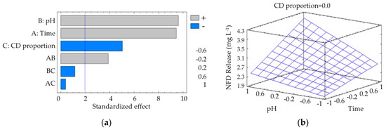 The release behavior of NFD from the formulations in PBS solution is presented in Figure 9. The Pareto chart (Figure 9a) shows that pH, time, hydrogel composition, and interaction between pH and time are statistically significant. Time and pH, and the interaction between pH and time exert a positive influence on the release of NFD, while the proportion of γ-CD in the hydrogel exerts a negative influence. As observed in Figure 9b, the estimated response surface shows that the release of NFD increased when the pH and time rose, reaching a maximum value at the end of each interval.