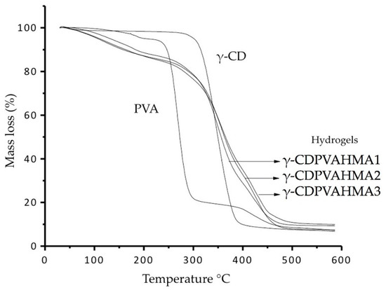 The TGA analyses of the starting materials (pure PVA and pure γ-CD) and of the γ-CDPVAHMA formulations were performed. The results are shown in Figure 10 where the γ-CD mass loss with a maximum decomposition at 357 °C was observed. Furthermore, The PVA decomposition at a maximum temperature of 280 °C was detected. A second minority decomposition at a temperature near 350 °C corresponding to PVA was observed.