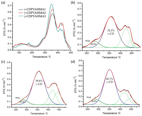 (a) DTG curves of γ-CDPVAHMAs and DTG and deconvolution curves of γ-CDPVAHMAs between 230 °C and 500 °C; (b) γ-CDPVAHMA1; (c) γ-CDPVAHMA2; and (d) γ-CDPVAHMA3.