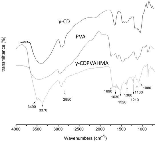 As is reported in Figure 12, a signal for γ-CD at 3370 cm−1 was observed due to symmetric stretching of O–H at 2920 cm−1. Other signals that included symmetric stretching of –CH2 at 1210 cm−1 (antisymmetric stretching of C–C) and signal bending vibration of O–H at frequencies near at 1000 cm−1 were evidenced. Moreover, the typical PVA spectrum signal was detected, for instance, a signal C–H broad alkyl stretching band to 2850 cm−1, a characteristic hydrogen bonded band of O–H between 3200 and 3500 cm−1 and absorption peaks at 1080 and 1130 cm−1 were observed. The FTIR spectra of γ-CD and PVA are described in Figure 12. These last vibrational bands were attributed to stretching band C–O and C–C of the PVA, respectively [54,55]. As shown in Figure 12, a signal from γ-CD at 3370 cm−1 that is assigned to symmetric stretching of O–H at 2920 cm−1 was observed. Other signals were detected including symmetric stretching of –CH2 at 1210 cm−1 (antisymmetric stretching of C–C) and signal bending vibration of O–H at frequencies near 1000 cm−1. Moreover, the typical signals of PVA spectrum were observed, for instance, a signal C–H broad alkyl stretching band at 2850 cm−1 and a characteristic hydrogen bonded band from O–H between 3200 and 3500 cm−1. Moreover, it was possible to observe an absorption peak at 1080 and 1130 cm−1 that was attributed to a stretching vibrational band of C–O in PVA (Ricciardi, 2004; Mansur, 2004). The γ-CDPVAHMA formation signals were demonstrated for the intensive OH-group stretching that was revealed between 3200 and 3500 cm−1 (O–H asymmetrical and symmetrical stretching vibrations) and the deformation vibrations at 1630 cm−1 (H–O–H). Furthermore, the above mentioned may be due to the presence of water molecules in the network of the formulation (hydration of hydrogel) [56]. Finally, a signal at 1690 cm−1 was detected that corresponds to the covalent ester bonds formed between PVA chains and MA (crosslinking molecule), as well as between MA (partially bound at one end with PVA) and the -OH groups of γ-CD.