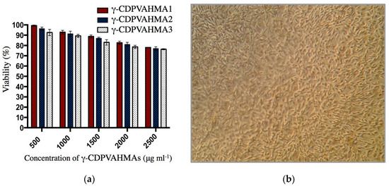 The MTT assay protocol was carried out to measure cell proliferation or cell cytotoxicity in fibroblast. The cytotoxic effect of the γ-CDPVAHMA1, γ-CDPVAHMA2, and γ-CDPVAHMA3 was evaluated by cell viability assay using L929 fibroblasts cells. Figure 13a shows fibroblast cell viability cocultured with different concentrations of γ-CDPVAHMAs (500–2500 μg mL−1) for 24 h. As displayed in Figure 13a, with an abrupt increase of the hydrogel amount, fibroblast cell viability reduced faintly, the viability ranging between 100% and 75%. Thus, the γ-CDPVAHMAs were able to maintain cell viability over 75%, although they were exposed to high concentrations of formulations. Figure 13b illustrates a microphotograph of fibroblasts cocultured with 2500 μg mL−1 of γ-CDPVAHMA3 formulation, where a high cell proliferation was detected. The cell viability analysis deduced that the formulations synthesized were biocompatible with low cell cytotoxicity. Consequently, these platforms based on hydrogels could be considered as a safe drug delivery system in relation to biocompatibility.