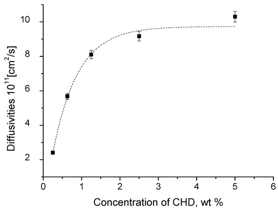 Equation (5) reflects the relation between the kinetic and diffusion constants, and thus provides another way to evidence that the CHD transport in the system is complicated by the degradation process. As was shown previously in [15,17,65], films, microspheres, ultrathin fibrils of PHB, and its blends with PLA or chitosan slowly degrade in aqueous media in accordance with a zero-order equation. Moreover, recent studies of degradation in a hydrolytic medium or in the presence of enzymes showed that the surface of the biopolymer is involved in the loss of weight of PHB (S-type degradation) [57]. Surface degradation is typical for nonpolar polymer systems because the solubility of water in their bulk is small. Therefore, hydrolysis at the polymer/solution boundary layer, where water molecules easier interact with ester groups of PHB, becomes more probable.