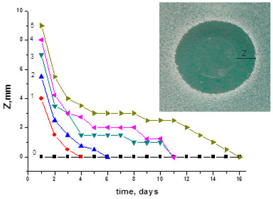 Figure 3 indicates the moving front of antibacterial inhibition zone (Z) for every PU sample located in the center of the agar gel medium, in accordance with the standard Kirby-Bauer method [51]. From this figure it is follows that the strongest antibacterial effect was observed in the first 80–100 h, and then the action of CHD was sharply decreased and progressively finalized in about 11–16 days).