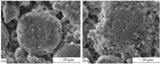 The morphology of PHB films as revealed by the SEM technique, was composed of two types of globules: spherical globules (Figure 4a) and deformed coalescing globules (Figure 4b). In turn, all polymer microparticles were characterized by the fine surface structure, where smaller spherical elements were sufficiently detectable. The diameters of these elements corresponded to the submicron range and were close to the diameters of natural PHB globules formed in bacteria-produced units of the biopolymer [63].