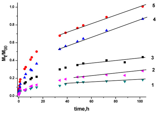 For the study of controlled release profiles of CHD, PU films with the different antiseptic content in the interval 0.25–5.0 wt % were used. Based on the results obtained, the release kinetics has been recorded as experimental points reflecting antiseptic release from PU films of constant thickness, ~70 µm. Below, in Figure 1, the corresponding release profiles are depicted.