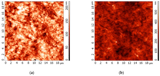AFM topographic images of PHB films with a scan size of 18 × 18 μm at general magnification ×300: the rough surface of fresh-prepared sample exposed to glass (a); the sample exposed to phosphate buffer at 83 days (b).