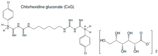 CHD is readily soluble in aqueous media that enhances its controlled release from a packaging material into food tissue areas such as juicy fruits and fresh meat. Despite the fact that the antiseptic given has been widely used in medicine as a loading chemical in surgical catheters, short-term implants, in dentistry and for oral mucosal delivery [38], its application in the packaging is still fairly limited. Nowadays, for the innovative design of active barrier materials where CHD provides the antibacterial property and simultaneously could progressively migrate into mimic or real foodsas the controlled-delivery agent, there are several polymer systems, namely the porous hybrids of silica [39], paperboard packaging modified by microfibrillar cellulose [40], β-dextrin-cellulose barrier complexes [41], and nano-structured fibrillar cellulose as a coating [42,43], or as nanocrystalline matrices [44].