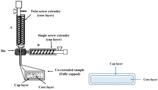 However, the addition of relevant additives into the entire material undoubtedly leads to increased production costs. Coextrusion has been widely utilized in the plastic industry. Two or more extruders are used to simultaneously extrude two or more polymers in a single head and subsequently die in order to produce a multi-layer panel or a sheet structure. This technology has been increasingly used in the development and production of WPCs [24,25,26,27,28,29,30,31]. Coextrusion technology can produce WPCs with different properties for the inner and outer layers. By its functional design of the cap layer (i.e., core shell), the relative performance of WPCs can be improved [31]. In addition to co-extrusion technology, it is important to produce WPCs with age-resistant surfaces.
