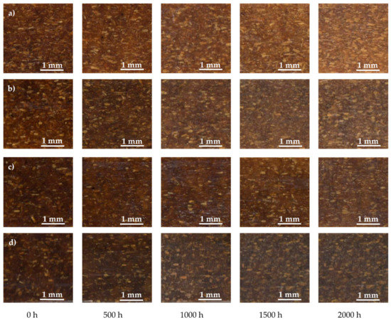 Figure 2 shows the visual appearance of the unweathered and weathered composites after 2000 h. Before aging, the surface color of the samples containing UV326 (Figure 2a) almost retained their original yellow-brown color. On the other hand, for samples with the added BF, their surface color was darker (Figure 2b–d, samples at 0 h). However, as shown in Figure 3, BF did not lead to clear changes in the surface color before aging.