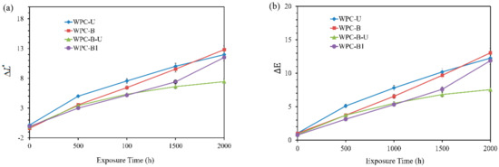 By increasing the aging time, all the samples became lighter and the color changed to a greater extent (Figure 3). was utilized to understand the degree of fading in the weathered HDPE/WF composites, relative to their original color. The most obvious change in lightness was observed in the first 500 h (Figure 3a), indicating that the fabricated composites are distinctly discolored in the first 500 h of weathering. Scissions of the HDPE molecular chain are well known to occur immediately, owing to photodegradation, leading to the decreased density of the HDPE amorphous regions. In addition, the migration of short-chain hydrocarbons to the surface and the photobleaching of lignin lead to the change in lightness [13]. The lightness of WPC-U increased to the greatest extent, while other BF-containing shells changed to a smaller extent, indicating that the BF-containing shell retards lightness to a better extent compared to UV326. This trend was maintained until 1500 h. After 1500 h, the lightness of the shell containing UV326 decreased and became less than that of the shell filled only with BF when the test was carried out at 2000 h. For the shell containing UV326 and BF, it lightened to a marginal extent which was far less than all other formulae, indicating that the simultaneous use of UV326 and BF is better for reducing lightness than using either individually.