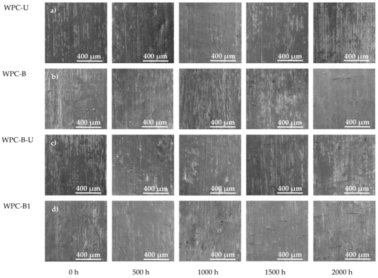 Visual photographs (30×) of all groups of composite shells as a function of the weathering time, with: (a) WPC-U comprising 20% WF and 2% UV 326; (b) WPC-B comprising 12% WF and 8% BF; (c) WPC-B-U comprising 12% WF, 8% BF, and 2% UV 326; and, (d) WPC-B1comprising 8% WF and 12% BF.