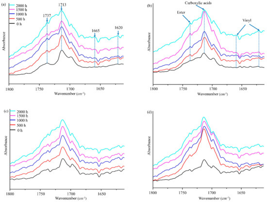 The sample with the added UV326, and a mixture of BF and UV326, revealed lower carbonyl group absorbance (Figure 5a,c), i.e., a lower degradation degree compared to the sample with the added BF (Figure 5b,d), related to the prominent light-absorption capability of UV326. When compounding UV326 and BF (Figure 5c) as the anti-UV agent, the surface chemical bonds exhibited few changes after 1000 h of UV-accelerated weathering; the duration for resistance to UV-accelerated weathering was prolonged up to 2000 h based on the above analysis of color and surface morphology in this study. This indicates that the addition of this compound system exhibits excellent durability and good application prospects.