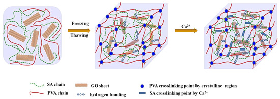 The dual crosslinking mechanisms of GO reinforced SA/PVA DN hydrogels were schematically presented in Figure 1. As could be seen, PVA chains were crosslinked by forming crystalline regions during the freezing/thawing treatments of PVA solution. On the other hand, alginate chains were crosslinked by Ca2+ ions, as described elsewhere [24]. Furthermore, the presence of GO offered hydrogen bonding interaction between GO sheets and PVA/SA chains. Therefore, GO sheets worked as additional crosslinking points in SA/PVA DN hydrogels. This conclusion was further confirmed by FTIR and SEM studies.