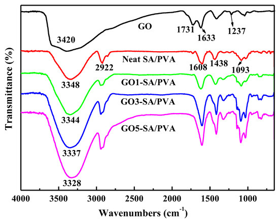 FTIR spectrometry was employed for monitoring the interactions between GO sheets and polymer networks. As shown in Figure 2, the FTIR spectrum of GO exhibited characteristic peaks of –OH, C=O, C=C, and C–O–C at 3420, 1731, 1633, and 1237 cm−1, respectively. For neat SA/PVA, the predominant peaks located at 3348 and 2922 are ascribed to the stretching vibrations of –OH and –CH2, respectively. The peaks at 1608 and 1438 cm−1 are attributed to the asymmetric and symmetric stretching vibrations of carboxylate ions, respectively [25]. The characteristic peak located at 1093 cm−1 was due to the stretching vibration of C–O–C. In comparison with neat SA/PVA, GO reinforced SA/PVA DN hydrogels exhibited lower wave numbers, possibly due to the dissociation of hydrogen bonding among the hydroxyl groups in PVA and formation of new hydrogen bonding between the hydroxyl groups of PVA/SA with hydroxyl groups of GO sheets [18].