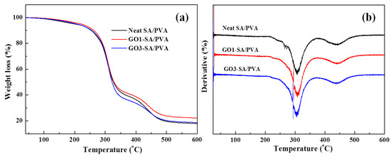 TGA (TA Instruments, New Castle, DE, USA) and corresponding differential thermogravimetric analysis (DTG) curves are shown in Figure 3a,b, respectively. TGA thermograms exhibited the good thermal stability of specimens below 250 °C. This slight weight loss (8%) was attributed to the dissociation of water [19]. Sharp mass loss was observed around 265–340 °C due to the decomposition of polymer networks. It was noted that the weight loss of DN hydrogels with different GO loadings differed greatly. GO3-SA/PVA exhibited a weight loss of 52%, whereas GO1-SA/PVA exhibited a weight loss of 48%. However, the introduction of GO into SA/PVA DN hydrogels did not improve its thermal stability much.