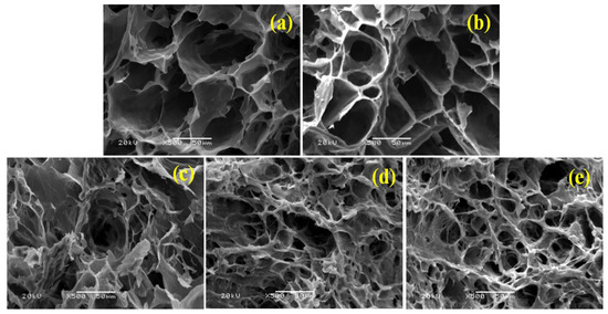 For further investigating the influence of GO sheets on the morphology of SA/PVA DN hydrogels, samples with different GO loadings were freeze-dried, then coated with a thin layer of gold and subjected to SEM examinations. The results were shown in Figure 5. It could be observed that all SA/PVA DN hydrogels exhibited a porous 3D structure, consistent with previous reports [27,28]. However, with increasing GO contents, the SA/PVA composites exhibited smaller pore size, demonstrating the formation of an improved degree of crosslinking. The crosslinking of SA/PVA by GO sheets via hydrogen bonding interactions accounted for this improved degree of crosslinking. Moreover, this increased degree of crosslinking could also enhance the mechanical property of SA/PVA DN hydrogels.