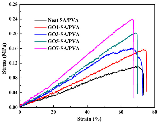 The stress-strain curves of the SA/PVA DN hydrogels with different GO loadings are shown in Figure 6. It is known that the degree of crystallinity, degree of crosslinking, and nanofiller dosage can influence the mechanical properties of composites greatly. As depicted, with increasing GO amounts, the SA/PVA DN hydrogels exhibited a tendency to decrease after an increase in degree of crystallinity. On the other hand, the degree of crosslinking was always increased with increasing GO contents. On account of the enhancements by GO sheets and degree of crosslinking, the fracture strength of GO reinforced SA/PVA hydrogels increased from 0.11 MPa for neat SA/PVA to 0.24 MPa for GO7-SA/PVA. In addition, it is worthy to note that the elongation at break of the composite hydrogels increased first, followed by decreasing. The increase in elongation at break for SA/PVA DN hydrogels with a small amount of GO can be ascribed to the formation of hydrogen bonding interaction between GO and polymer chains, as described by Fan et al. [29]. However, excessive embedment of GO sheets will restrict the elasticity of the polymer chains, therefore resulting in a reduction in elongation at break [30].